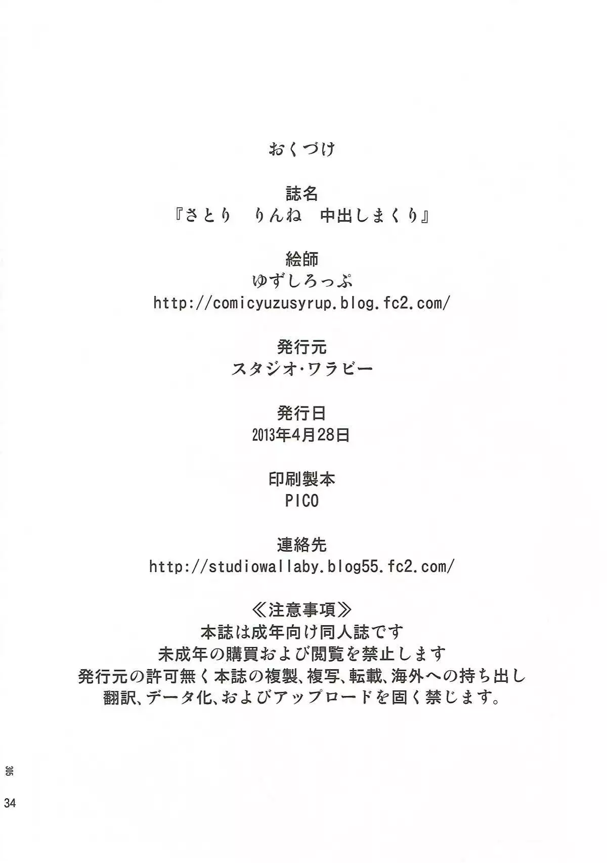 (COMIC1☆7) [Studio Wallaby (Yuzu Syrup)] Satori Rinne Nakadashimakuri (Chousoku Henkei Gyrozetter)
